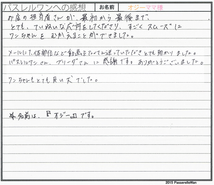 長野駅にてブリーダーさんよりお引き渡しさせて頂きました。お迎えにあたり、はじめはご不安もあったことと思いますが、一つ一つ、ブリーダーさんも真摯にご質問にお答えくださり、解決していけましたね^^ オジー君、お名前の由来通りSご家族様の一員として大事に幸せに育っていくことです♪ また是非成長のお写真お送りくださいませ! このたびは当店をご利用いただき誠にありがとうございました。