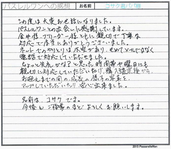 お仕事がご多忙の中、大阪府のブリーダーさん宅までご見学に日を楽しみにお越しくださいました。 はじめての飼育で不安もある中、ブリーダーさんにもたくさん質問してみて、一つずつ解消していくうちに安心、自信に変わっていけたようで良かったです。 お迎え後環境の変化もあり、今は大変な時期かもしれませんが、家族の絆をしっかり深めて乗り越えてまいりましょう^^ これからも、ご不安なことやわからないことがありましたらお気軽に何度でもご連絡下さい☆ このたびは当店をご利用いただき誠にありがとうございました。