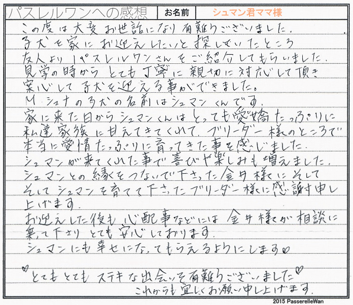 ご見学・お迎えと2度兵庫県の犬舎まで足を運んでくださいました。 可愛い娘様とご一緒に新しいご家族様の一員との出会いを楽しみにお越しくださいました。 当方より巣立ちましたご家族様からのご紹介で今回ご縁繋ぎのお手伝いをさせていただきました。毎回巣立ったご家族様方よりご紹介をくださり本当に嬉しく感謝しております。 新しい環境でもお利口にシュマン君過ごしているようで、本当に頼もしい限りです^^ 困った時は引き続きご遠慮なくいつでもお気軽にご連絡・ご相談ください^^ このたびは当店をご利用いただき誠にありがとうございました。