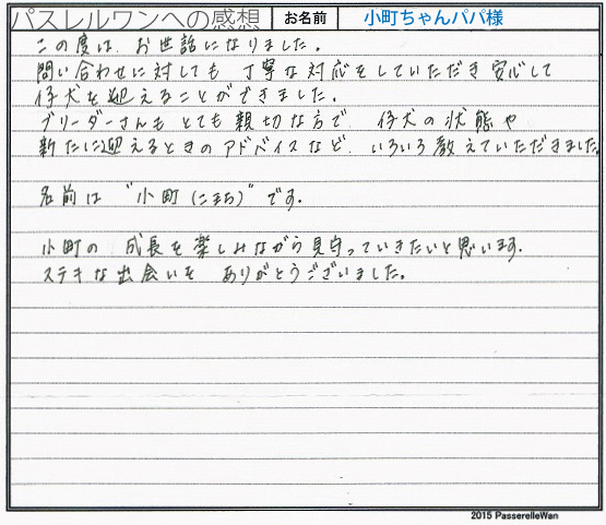 ご見学、お迎えと2度犬舎までお越しくださいました。 ご見学の際、お会いしました可愛い愛娘様とこれからどのようなドッグライフを送っていくのかがとても楽しみです。 ほのぼのとしたYご家族様の元でみやびちゃんも大らかに育つことでしょう^^ 何か困ったことがございましたらお気軽にいつでもご連絡下さい!近況のご報告もお待ちしております。 このたびは当店をご利用いただき誠にありがとうございました。