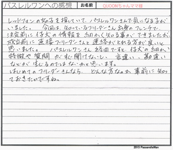 フレンチブルドッグと10頭近く多頭飼いされており大のフレンチ愛好家様でありますSご家族様。 お迎えの日は北海道から新潟空港までブリーダーさんがQUOONちゃんを連れお届けに上がってくださいました。 お迎え後も長旅の疲れもなんのその、元気に成長しているようで安心しております^^ お問い合わせの段階でも、前向きにご検討頂いておりますご家族様には、ご希望があればご見学以外で直接ブリーダーさんとご連絡を取って頂くことも対応しております。 今回上手く伝達が出来ていない部分もあったようで・・、Sご家族様より頂戴しましたご感想は貴重なご意見としまして今後の運営に役立たせて頂きます。 これからもフレンチブルドッグの愛好家として見本になるSご家族様に期待しております! このたびは当店をご利用いただき誠にありがとうございました。
