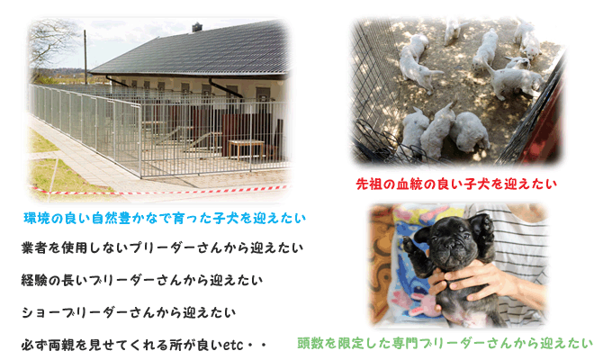近年、ブリーダーさんへ窓口を貸し出す投稿サイトの形態が増えておりますが、2,000人を超えるブリーダーさんと当然面識はなく、育てている環境も把握していないのが実情です。当方で犬舎環境があまりにもずさんでお断りしたパピーミルたちにおきましても、某サイトにて好評価を獲得しており毎月多くの子犬を販売しております。なかなか普段子犬や、子犬を産ませる環境を見慣れていない方々には判断が難しいところが大きいのだと感じます。路面・量販店においては。子犬にストレスのかかる展示販売の形態も、欧米先進国に続き根本から変わっていかなければならないと強く感じております。 それぞれに子犬選びのポイントで述べておりますようにメリット・デメリットがあり他社を否定するつもりは全くございません。ただ命を扱う者として少しモラルが欠如してるように思います。動物愛護法が改正され、対面説明・現物確認が必ず必要な現在において、遠方へご見学に出向くご家族様がより増えた中、より運営者側がご家族様の立場を考えサポートしていかなければなりません。