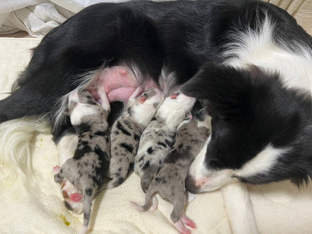 父犬・・・毛色:ブル―マール 母犬・・・毛色:ブラック&ホワイト ブルーマール男の子4頭生まれています☆ |